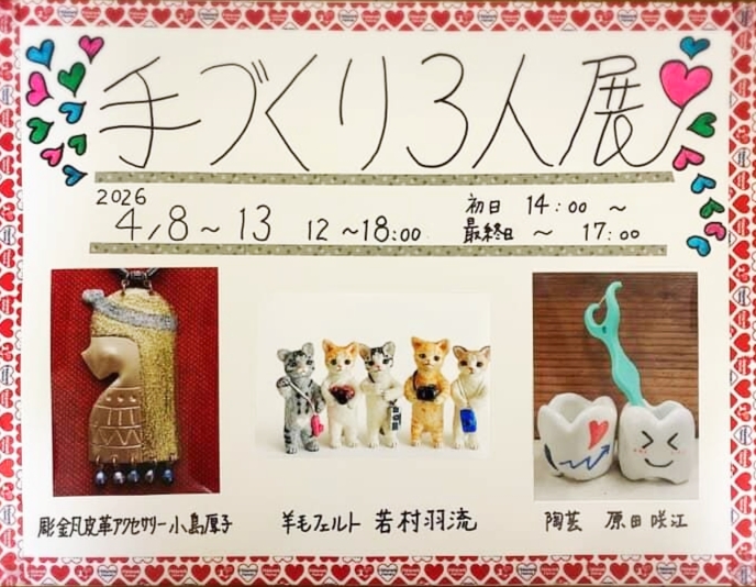 2026年2月7日 ギャラリー展示会 12~18時(※初日14時から/最終日17時まで) ★若村羽流(羊毛フェルト) https://www.instagram.com/wakamura_haru/?hl=ja ★小島厚子(皮革アクセサリー ) https://www.instagram.com/ten31kojima/?hl=ja ★原田咲江(陶器)