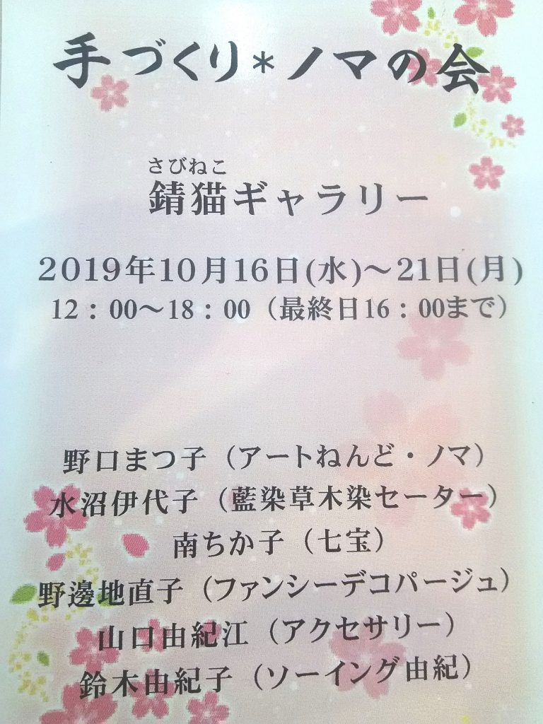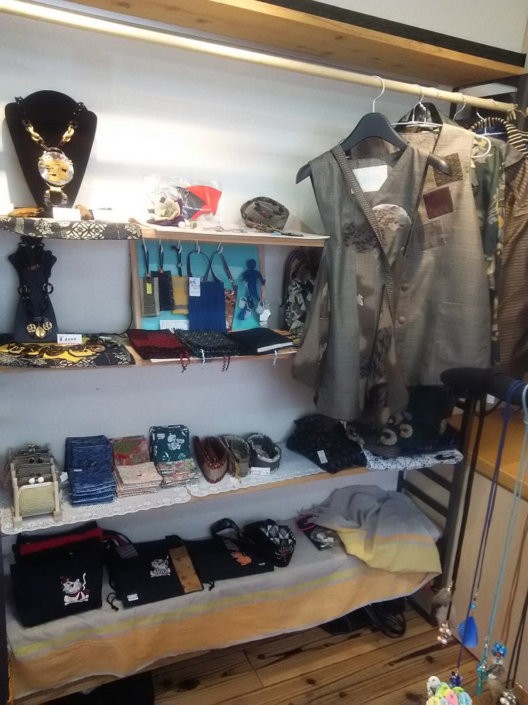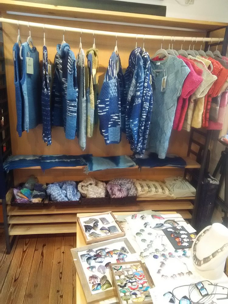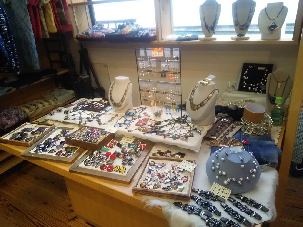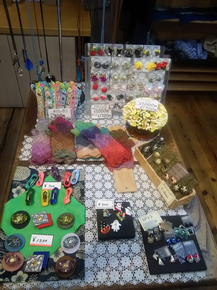 6人の作家による合同展示会。アクセサリー、草木染めスカーフ、フェルトショールなど